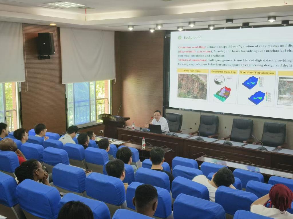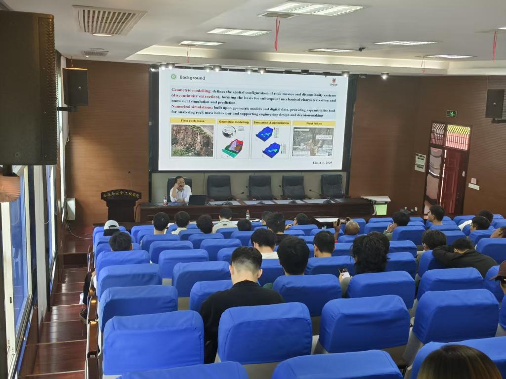 师生带来了题为《Automated Geological Discontinuity Extraction in Mining and Rock Engineering》的学术报告。报告会上,司博士重点介绍了其团队完成的两项研究工作:一是运用自动算法对矿山岩壁拍摄图像中的节理裂隙进行快速全面提取与识别,并将识别到的节理裂隙信息直接导入数值模型中,为后续数值模拟分析提供便利;二是针对钻孔岩芯图像处理技术,通过算法识别岩芯节理面的粗糙度等信息,利用拍摄得到的岩芯照片自动生成钻孔岩芯的数值计算模型。报告内容紧密结合工程实际,展示了岩石力学与人工智能技术交叉融合的实用价值。