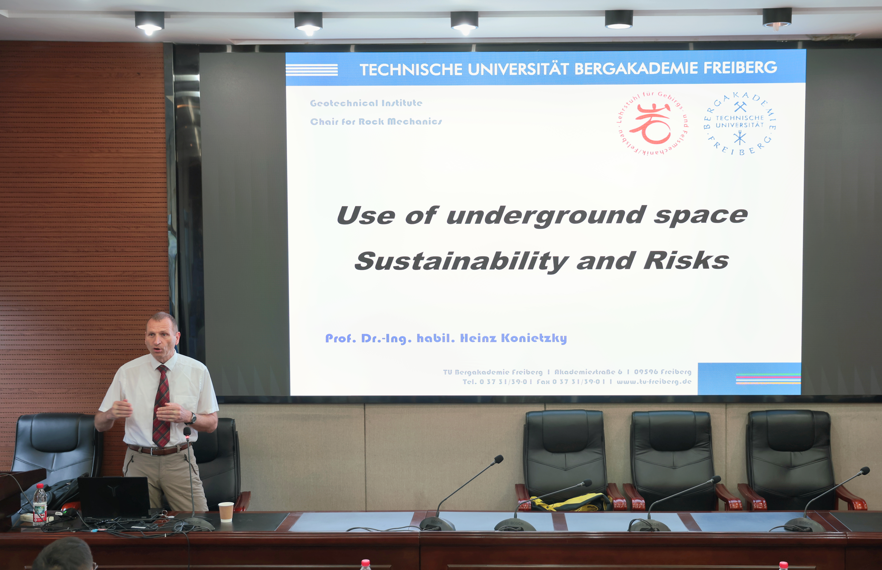 Heinz Konietzky 教授是德国终身教授、弗莱贝格工业大学岩土工程研究所主任,国际岩石力学与地下工程领域知名专家,长期从事岩石力学、数值模拟及地下空间安全稳定研究,学术成果丰硕、国际影响力广泛。此次Heinz Konietzky 教授为资源与安全工程师生带来了题为《Use of Underground Space - Potential and Risk》的学术报告。